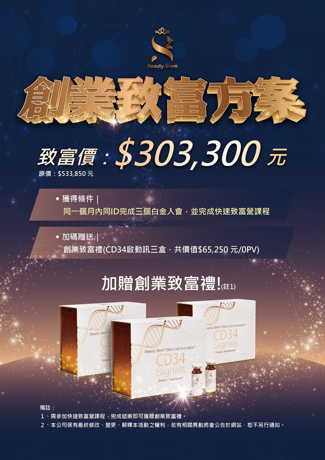 加碼贈送▕ 創業致富禮(CD34啟動訊三盒,共價值$65,250元/0PV)(註1)