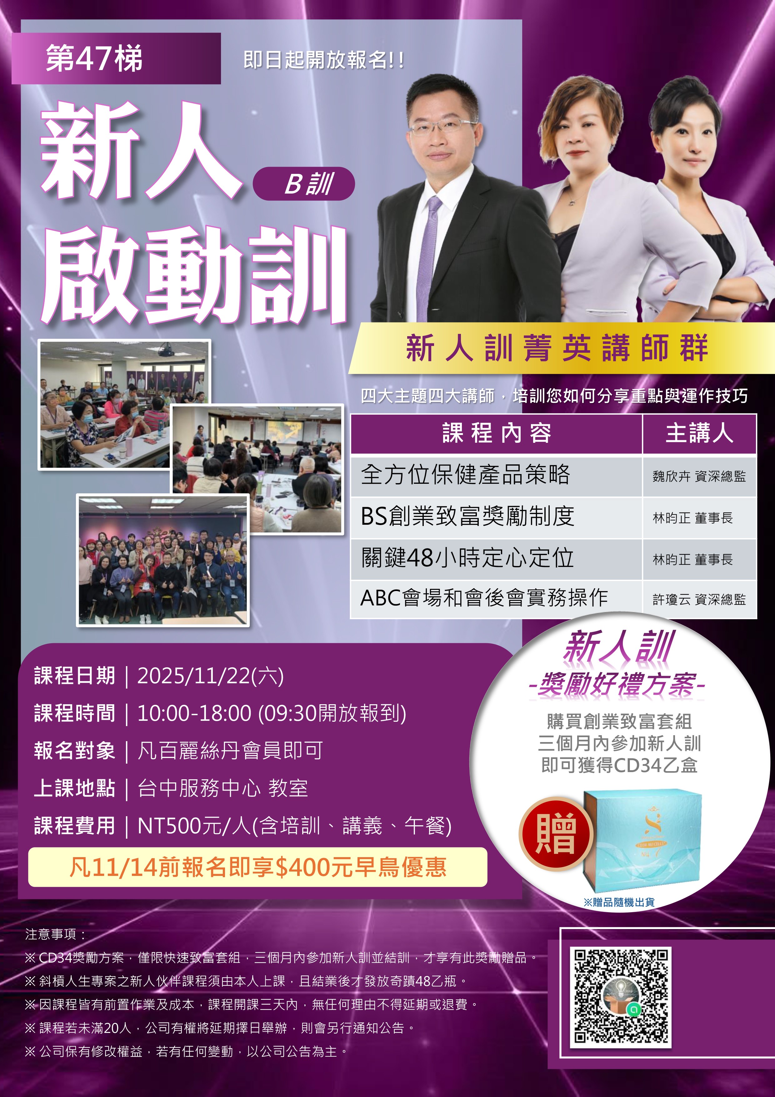 報名參加新人啟動訓,就是啟動您的BS連鎖事業的開始,淺顯易懂系統化教學,點燃您開創事業的心,