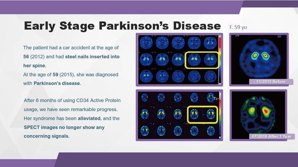Figure 5: SPECT imaging showing alleviated Parkinson's syndrome and improved neural activity after 1 year.