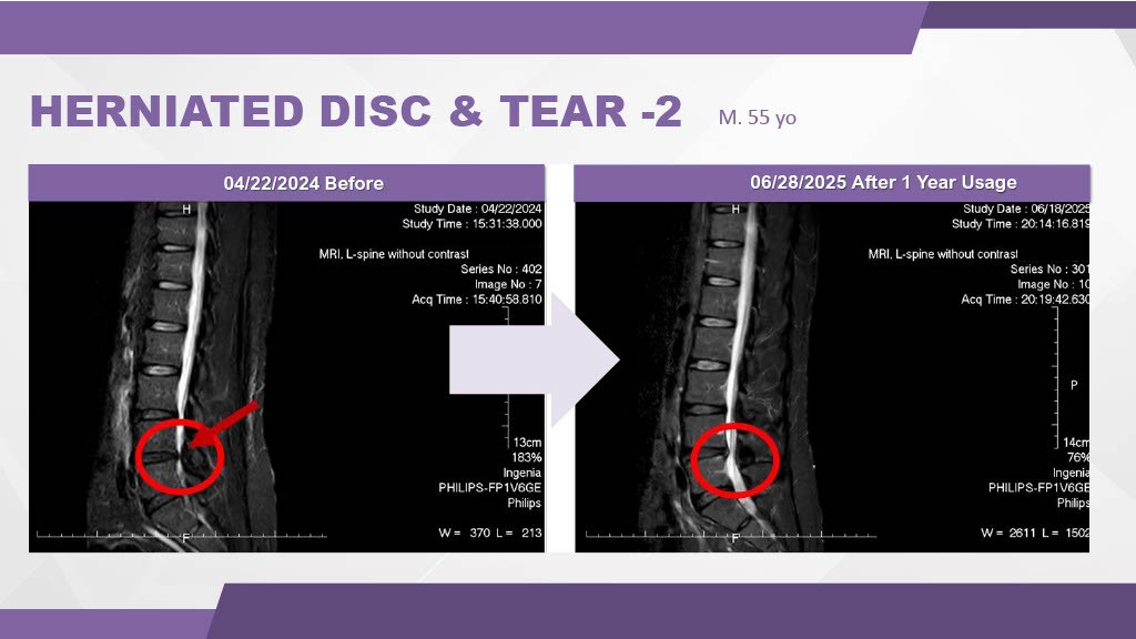 Figure 8: MRI evidence of non-surgical repair of a herniated lumbar disc (L-Spine) after 1 year of usage.