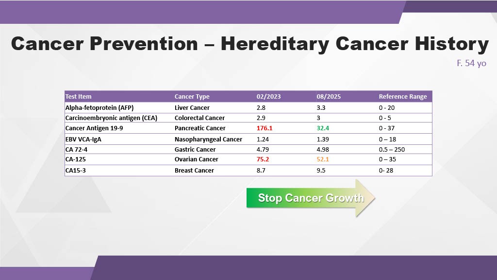 Figure 15: Verified reduction in tumor markers for Pancreatic (CA 19-9) and Ovarian (CA-125) cancer risks following immune modulation.
