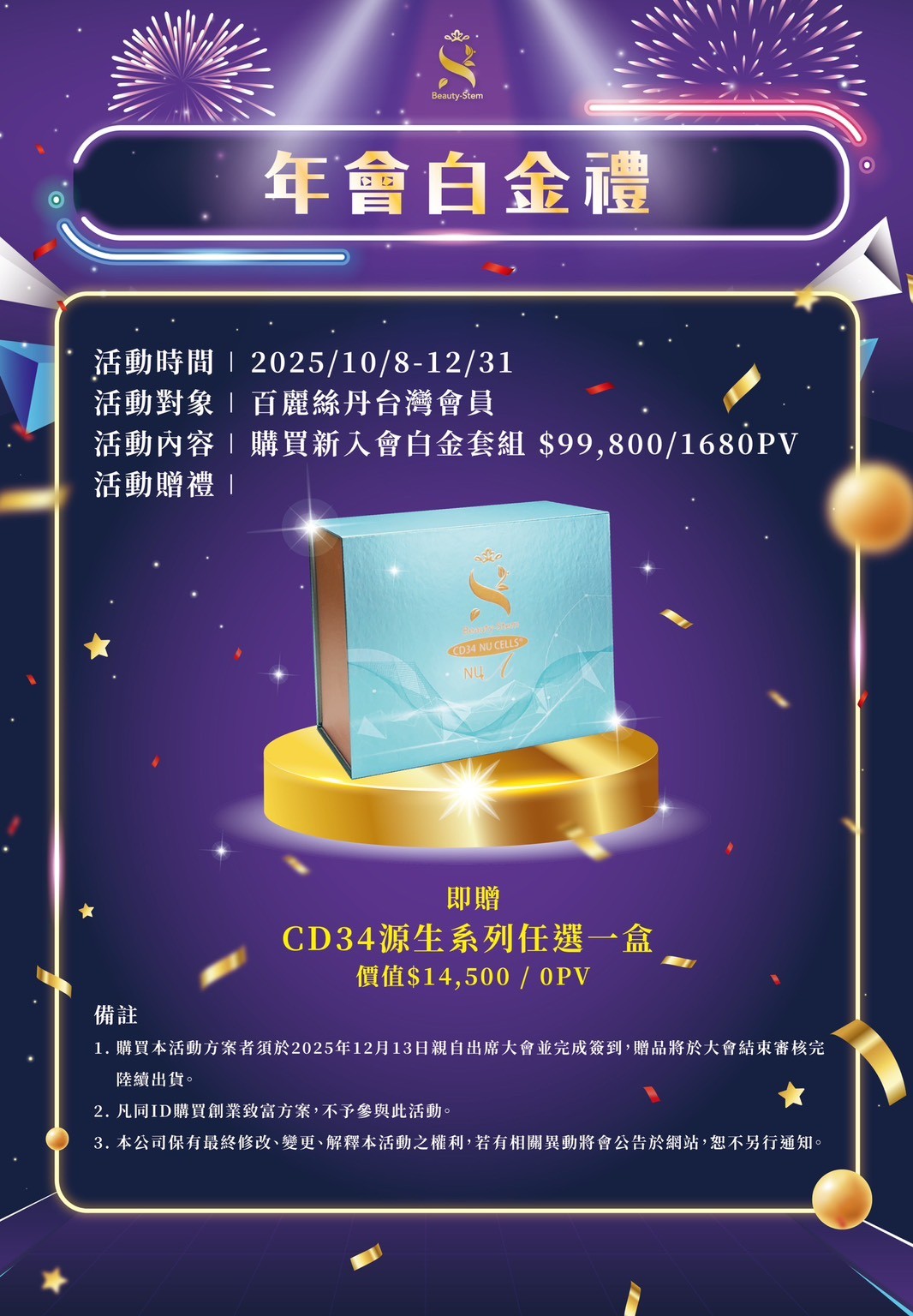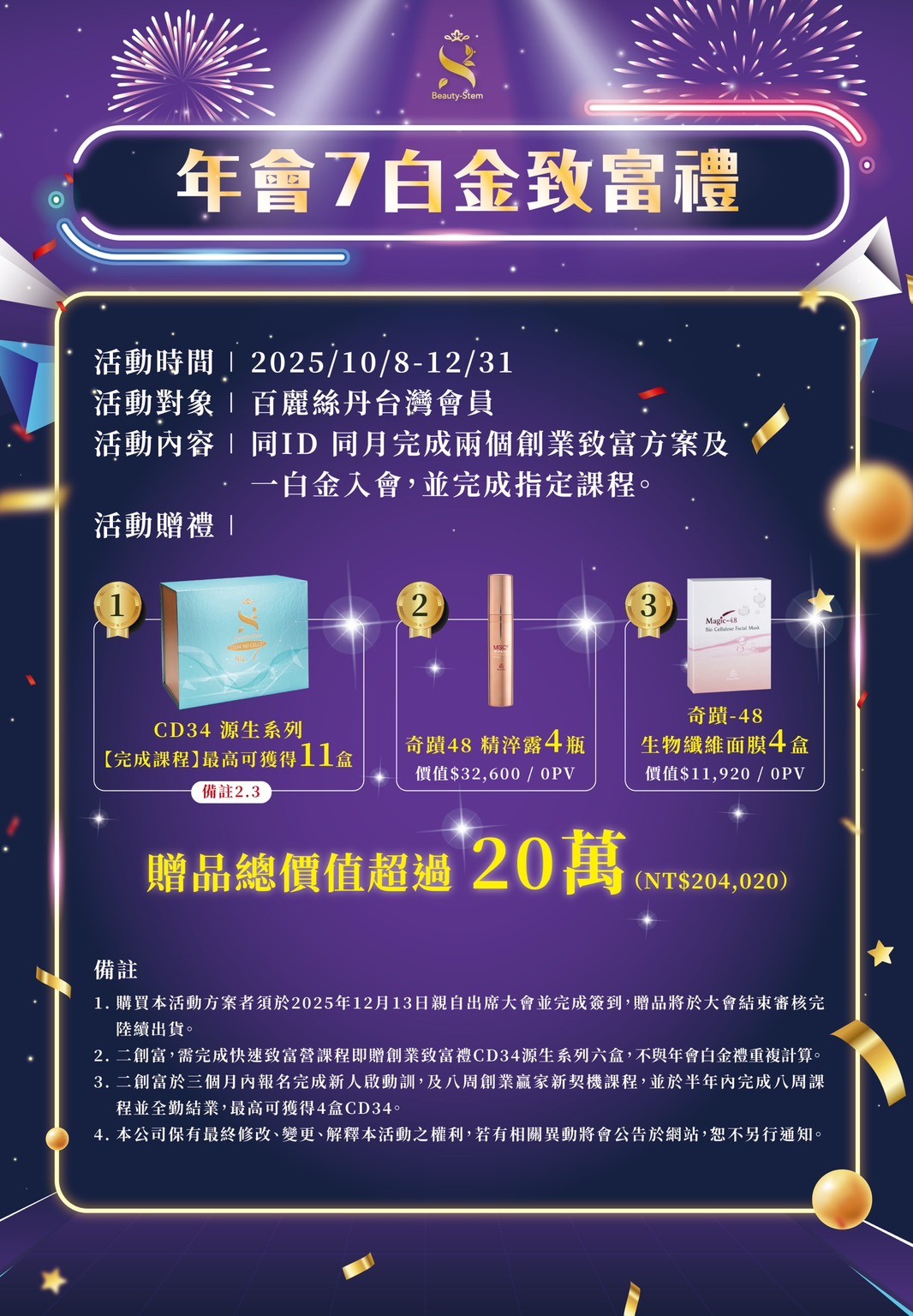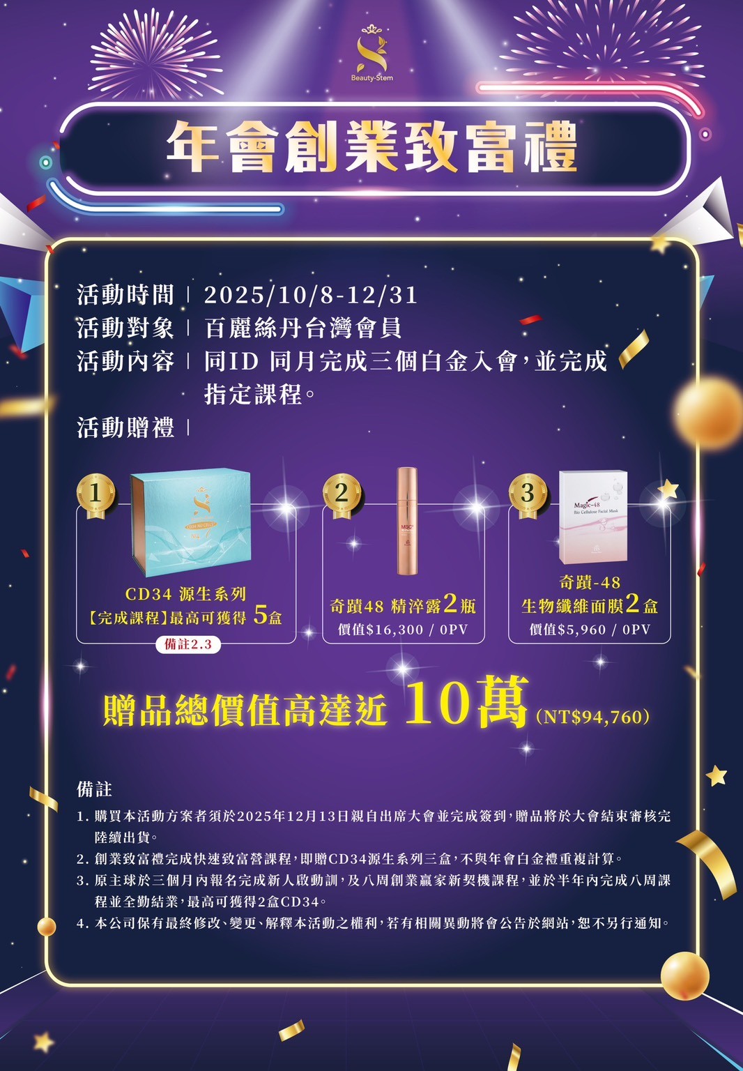 2. 創業致富禮完成快速致富營課程,即赠CD34源生系列三盒,不與年會白金禮重複度計算。