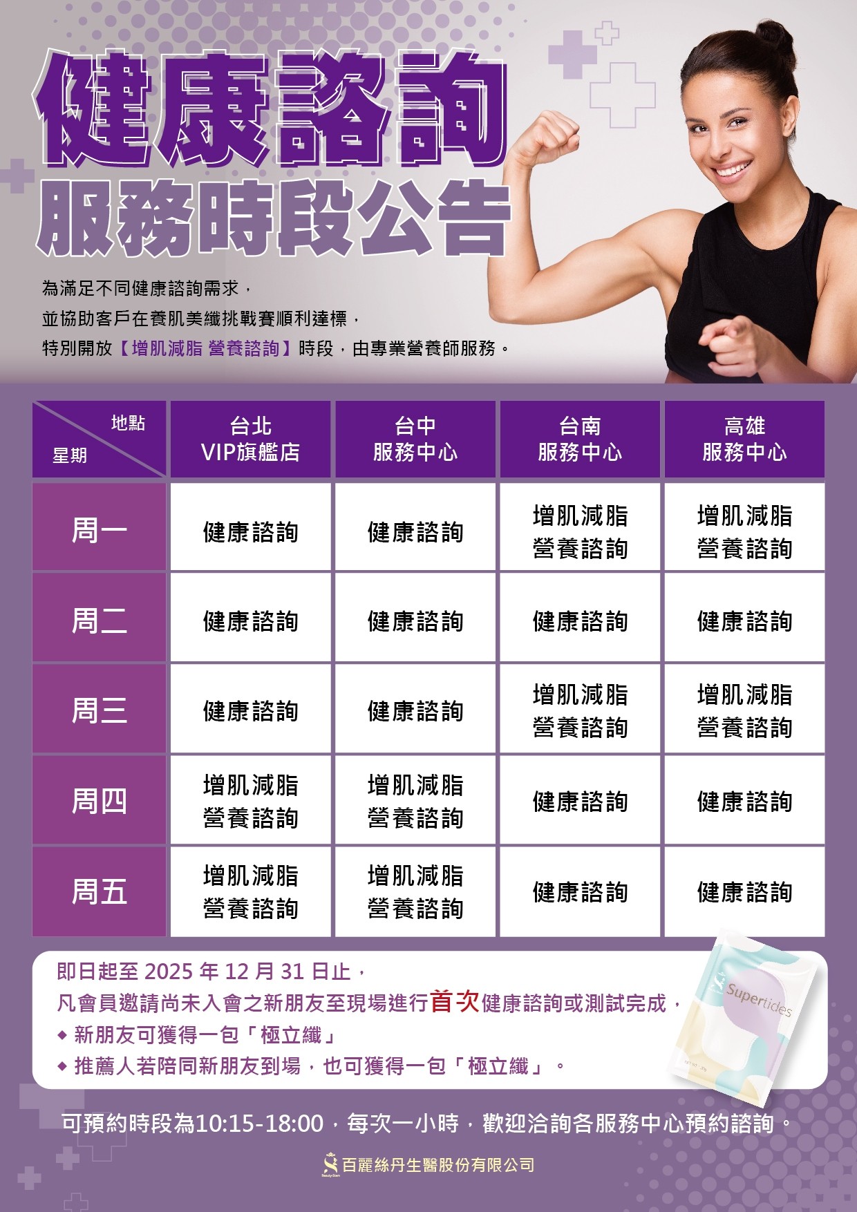 每週一至週五 10:15–18:00 (每次1小時)營養諮詢時段,也可同步健康諮詢!