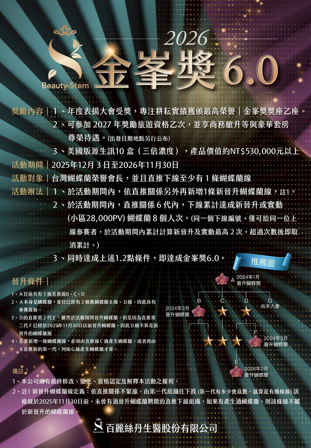 <註1> 新晉升蝴蝶蘭線定義:依直推關係不緊縮,由第一代組織往下找(第一代有多少會員數,就算是有幾條線)該條線於2025年11月30日前,未曾有過晉升蝴蝶蘭聘階的直推下線組織,如果有產生過蝴蝶蘭,則該條線不屬於新晉升的蝴蝶蘭線。
