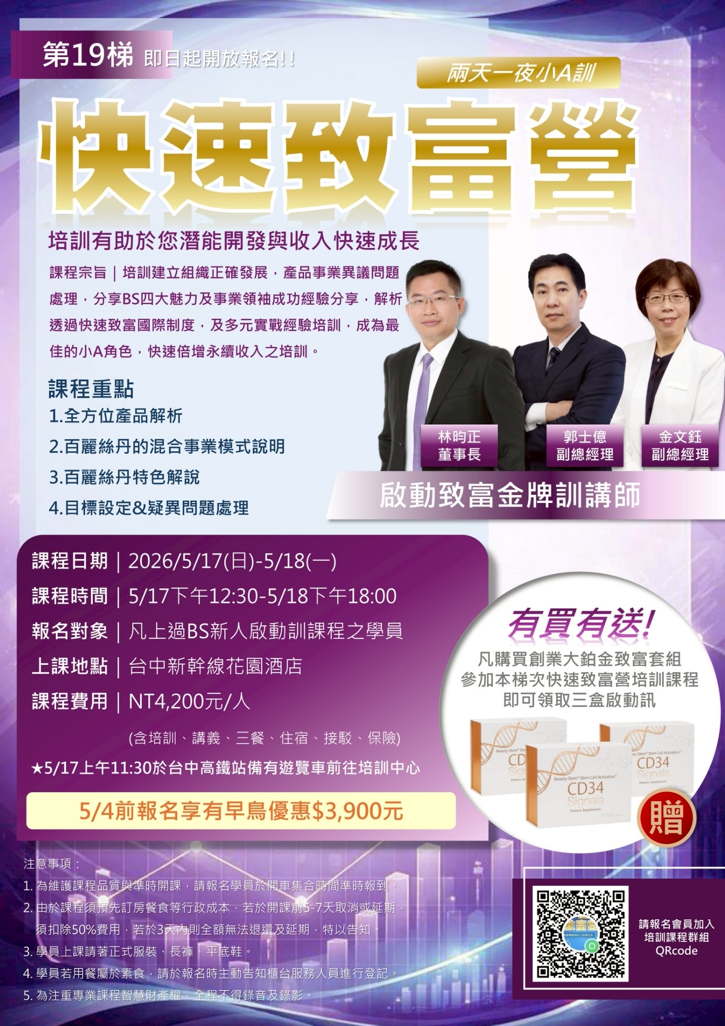 凡購買創業大鉑金致富套組,參加本梯次快速致富營培訓課程,即可領取三盒啟動訊。