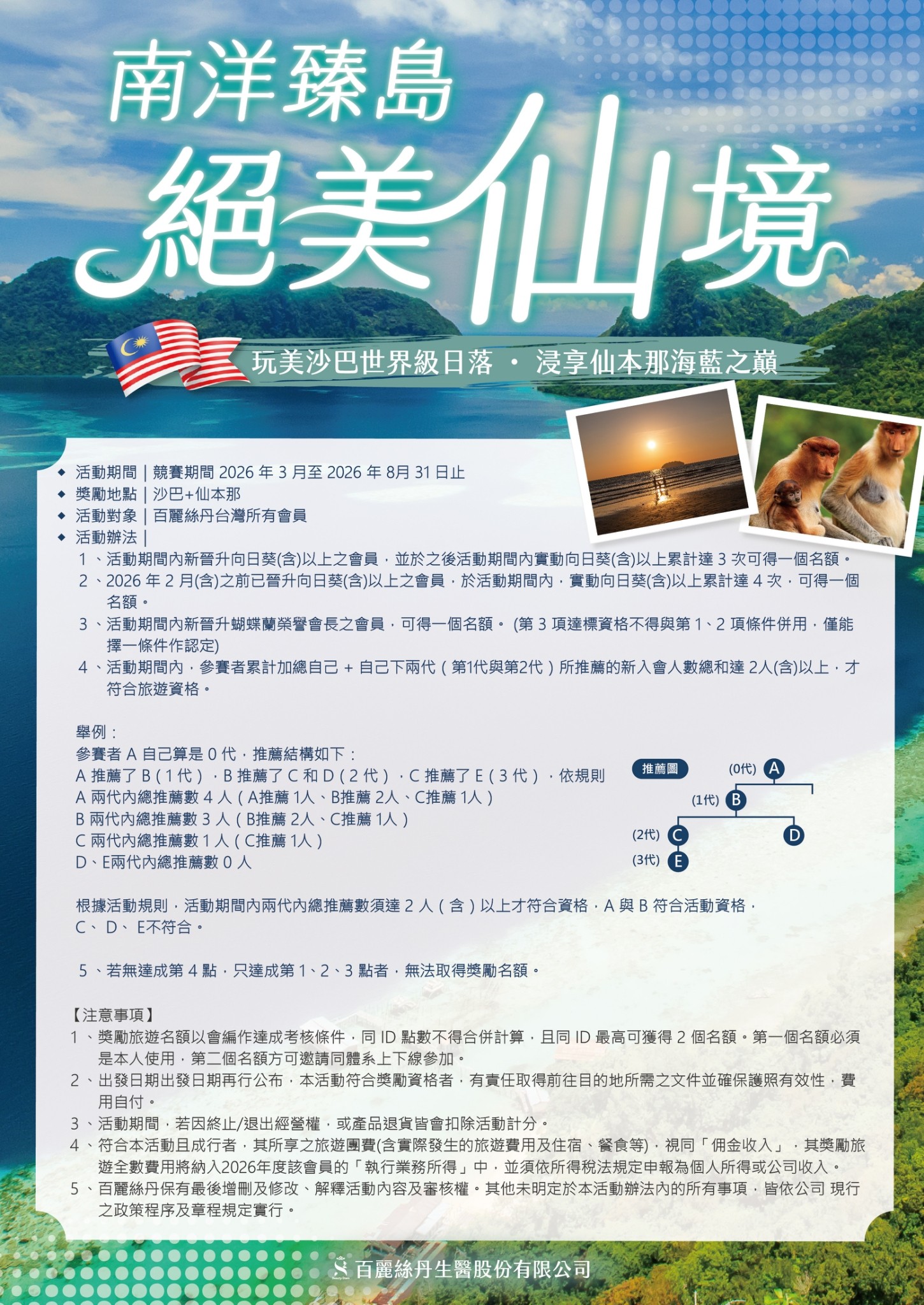 4. 活動期間內,參賽者累計加總自己 + 自己下兩代(第1代與第2代)所推薦的新入會人數總和達2人(含)以上,才符合旅遊資格。